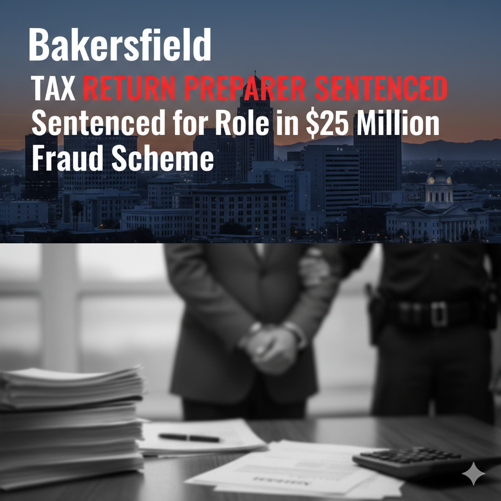 The U.S. Justice Department (“DOJ”) announced on November 17, 2025 that Victor Cruz, age 41, of Bakersfield, California was sentenced to 18 months in prison for participating in a scheme to submit fraudulent individual federal income tax returns that claimed $25 million in refunds.